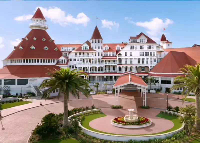 The Hotel del Coronado with its iconic red-roofed turrets and white Victorian architecture.